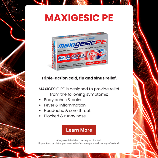 Only Maxigesic PE combines the power of paracetamol and ibuprofen with a nasal decongestant for triple action cold, flu and sinus relief.